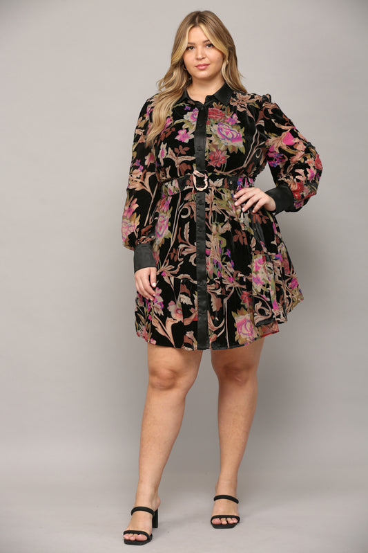 FLORAL VELVET FLARE LONG SLEEVE DRESS