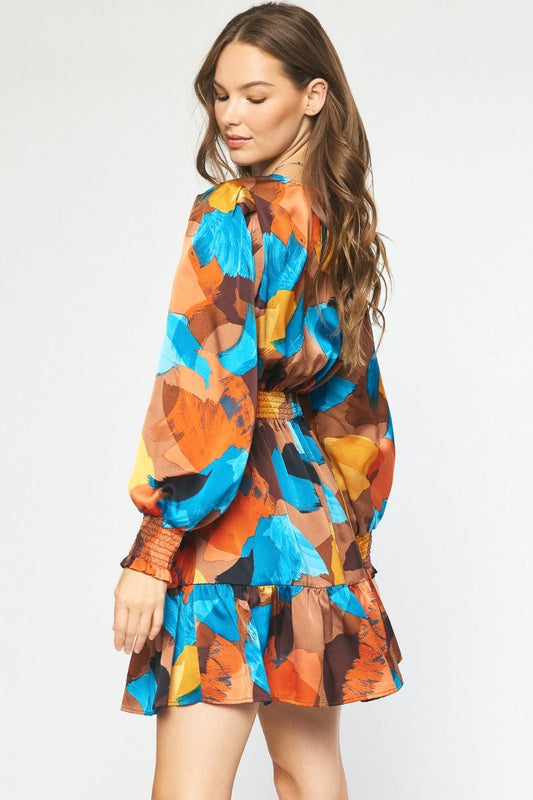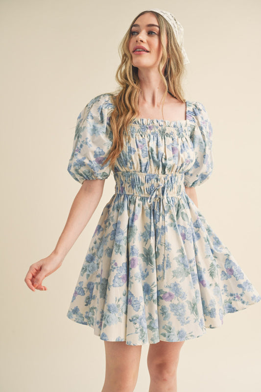 Ivory Blue Floral Puff Sleeve Mini Dress