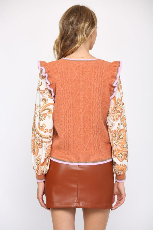 WOVEN CONTRAST RUFFLE SLEEVE SWEATER